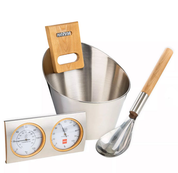 Dieses edle Sauna-Set aus rostfreiem Edelstahl vereint Langlebigkeit mit Funktionalität. Es umfasst einen robusten Eimer, eine praktische Schöpfkelle sowie ein präzises Hygrometer und Thermometer, die Ihnen helfen, die ideale Saunatemperatur und Luftfeuchtigkeit zu kontrollieren. Ein unverzichtbares Accessoire für ein anspruchsvolles Saunaerlebnis