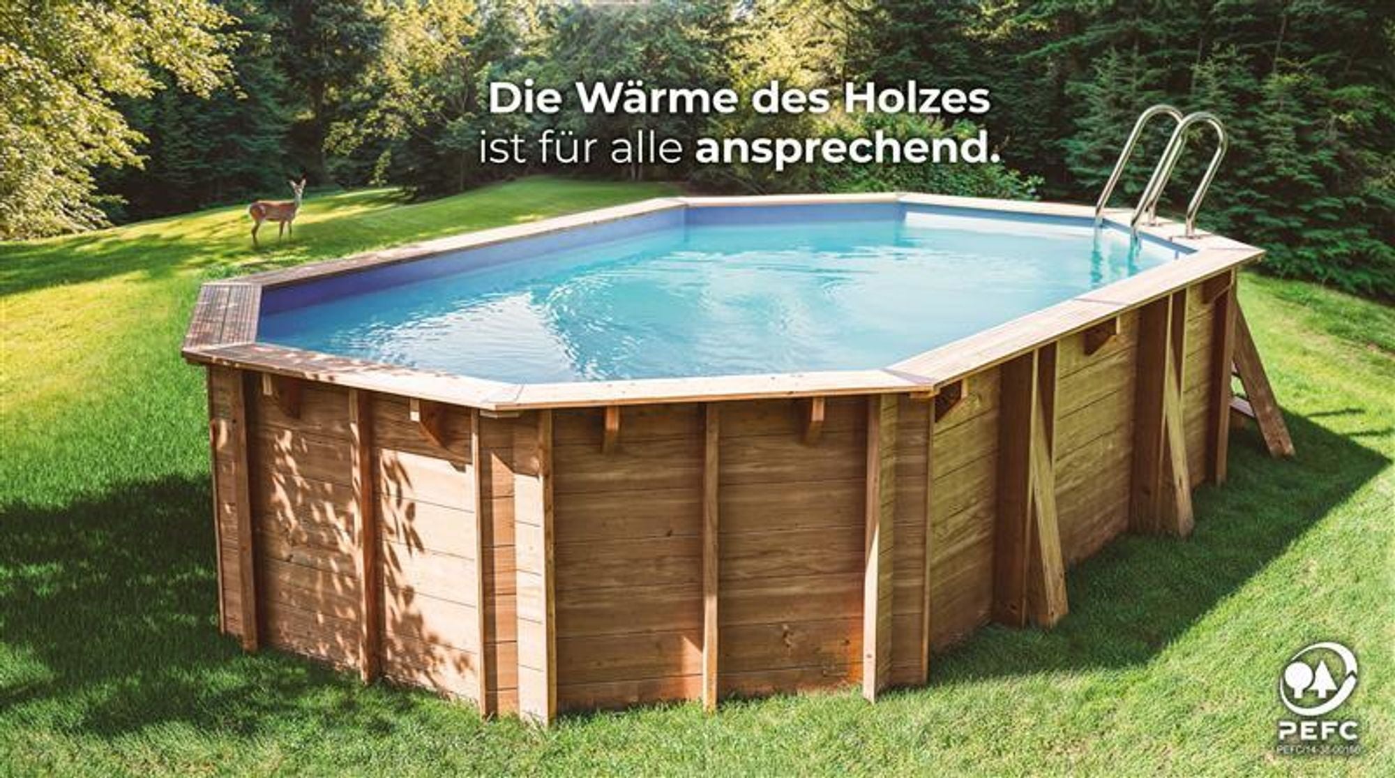 Als Material kommt französische Waldkiefer aus nachhaltiger Forstwirtschaft zum Einsatz. Durch die Imprägnierung im Kesseldruckverfahren (Klasse IV) wird das Holz besonders widerstandsfähig und langlebig. Die Poolfolie wird durch ein robustes Schutzvlies für Boden und Wände abgesichert und mithilfe eines Keilbiesen-Systems montiert. Dieses Befestigungssystem ermöglicht einen unkomplizierten Austausch der Folie, ohne den gesamten Pool zerlegen zu müssen.