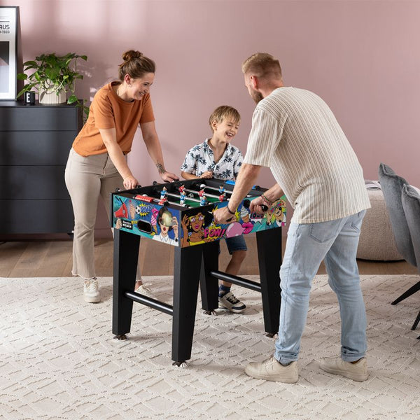 Mit nur 2 Spielstangen auf jeder Seite sorgt der sportliche Kicker für ein rasantes Spiel. Mit einem Gewicht von 21 kg kann der handliche Spieltisch von nur einer Person getragen oder nach Spielende einfach zur Seite gestellt werden.