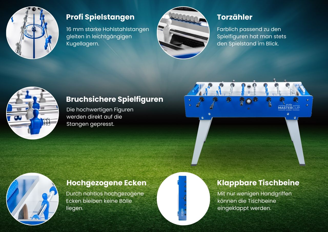 Das Modell MasterCup Foldy, hergestellt von Garlando, Made in Italy. Garlando ist offizieller Partner des Weltverbandes ITSF und gehört mit über 70 Jahren Erfahrung zum weltweit führenden Produzenten professioneller Fußballkicker. Nationale sowie internationale Meisterschaften werden auf Kickertischen von Garlando ausgetragen.